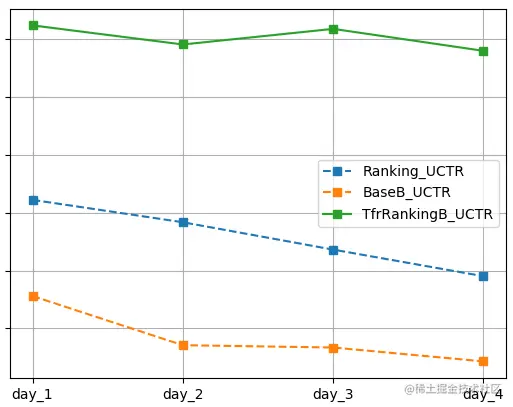 以上的几处不同是模型训练方式和评估指标上的不同,这也正是采用 TFR 框架带给我们的。而训练数据和模型本身,包括正则化项在内,TfrRankingB 和 Ranking 是完全一样。两个模型训练后,与 BaseB 一起在线上真实流量环境下测试完整 4 天,其中 day_1 和 day_2 为平日,day_3 和 day_4 是休息日。线上实验考查用户的 CTR(点击率)、UCTR(用户点击率)和 LPLAY(长播放占比),效果如下: