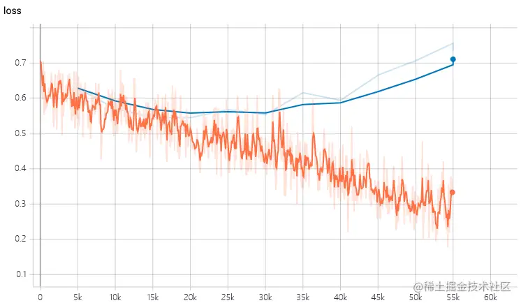 理论上,只要我们重写 TFR 源码中_GroupwiseRankingModel 类的 compute_logits 方法,就能够让 TFR 支持正则化了。具体的代码上如何处理可以参考这里(如何解决 TensorFlow Ranking 框架中的正则化问题)。在加入正则化项后,跟上图同样的模型训练时就没有那么严重的过拟合现象了: