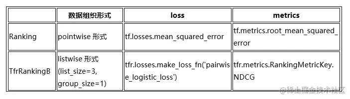 其中,TfrRankingB 相比较于 Ranking,模型结构完全一致,也就是采用同一个 Scoring Function,训练数据集也完全一致。但是由于 TfrRankingB 采用 TFR 框架训练的 LTR 模型,模型优化上有以下几处不同: