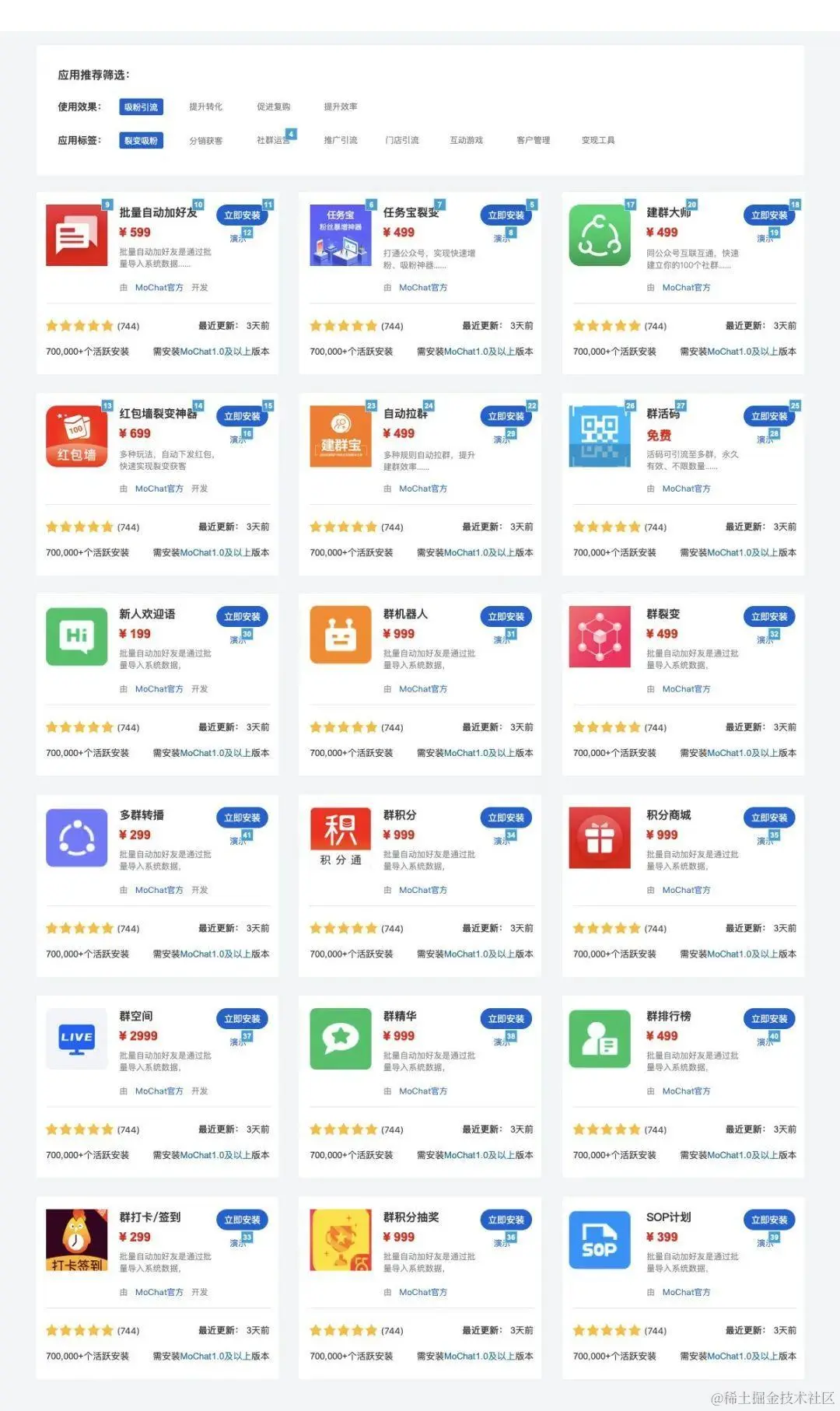 **变现能力:**第三方开发者可以根据 Mo.Chat 开源框架提供的能力快速开发应用,如引流吸粉、营销裂变、客户管理、社群运营等,上架到应用市场,帮助开发者、创业者快速变现。