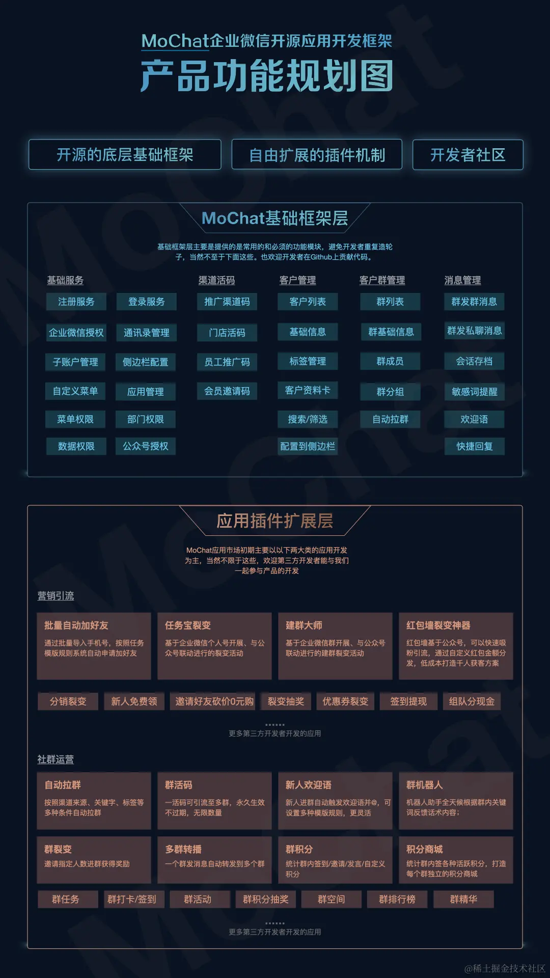 Mo.Chat 是一套开源的企业微信应用开发框架&引擎,用户可以在不需要任何编写代码的基础上,通过简单的设置和安装,在互联网上搭建属于自己的、具备完善功能、很强负载能力和可高度定制的企业微信应用服务。Mo.Chat 内置了七大能力:基础服务管理能力、渠道活码管理能力、客户管理能力、客户群管理能力、消息管理能力、侧边栏能力和应用插件扩展能力;通过 Mo.Chat 的发布,既可以满足开发者开箱即用的需求,又可以满足未来的场景定制化扩展。第三方的开发者还可以基于 Mo.Chat 开发框架开发各种应用,更多更好的服务好企业,打造一个百花齐放的全新企业微信社区生态。