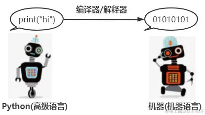 如上图:python、java、php都是高级语言,而计算机(机器)只能读懂机器语言(二进制),所以此时,如果Python想要直接传递输出hi这个信息给计算机时,计算机是不能直接理解的。