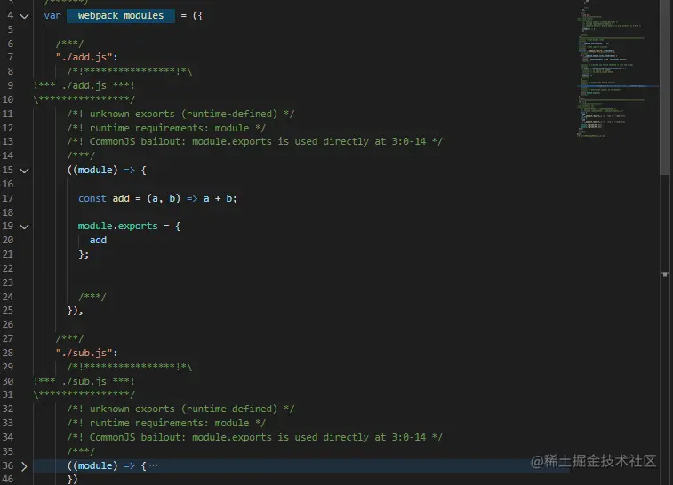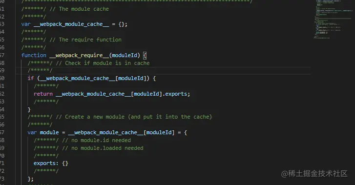 内部也比较简单,使用了 webpack_module_cache 缓存模块,第一次导入模块时 在 webpack_modules 根据模块id(如 './add.js"')导入相应的模块并写入缓存
