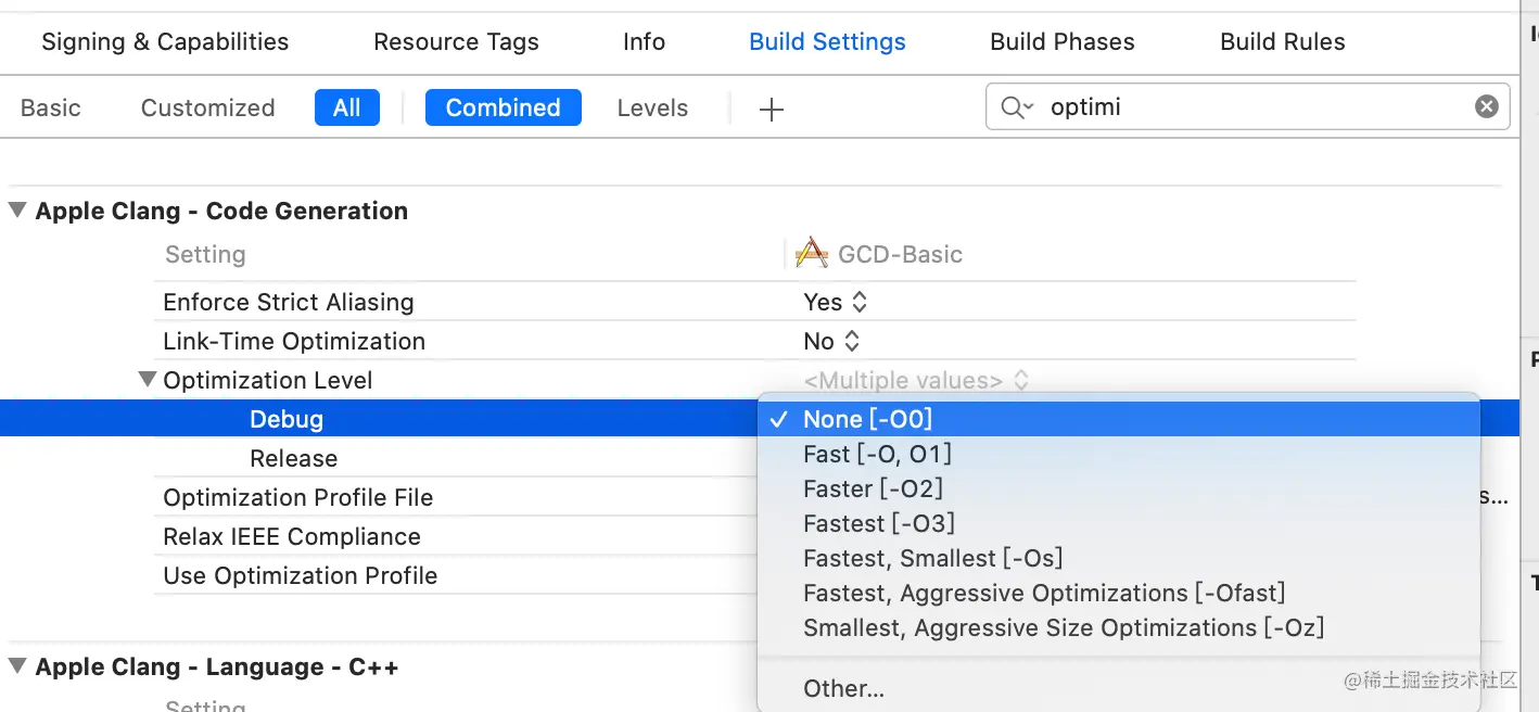 - 我们可以在Xcode的Build Settings中搜索Optimization,可以看到优化级别。(Debug模式默认None [O0]无优化,Release模式默认Fastest,Smallest [Os]最快最小)