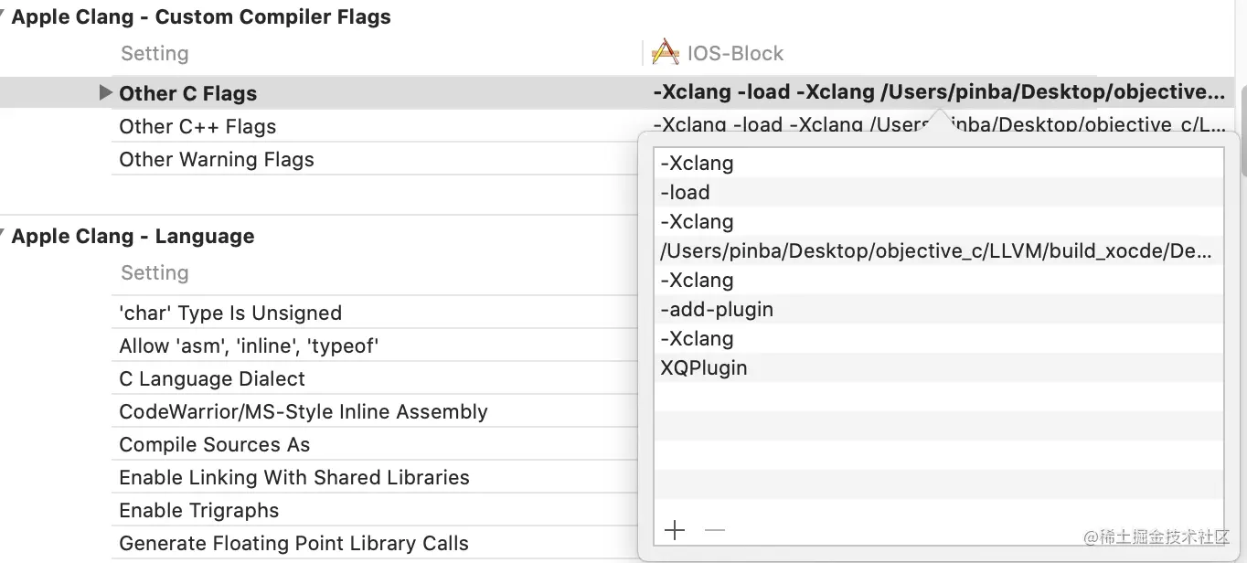 - 打开需要加载插件的Xcode项目,在Build Settings栏目中的Other C Flags添加上如下内容:
