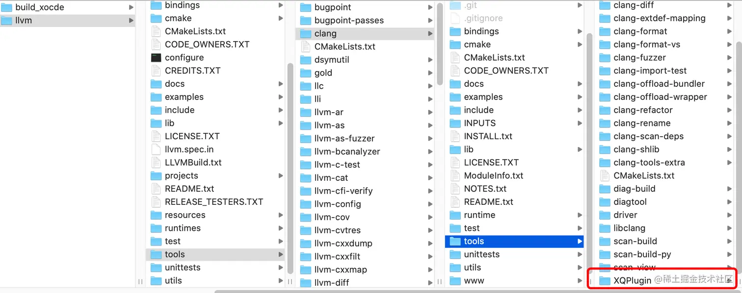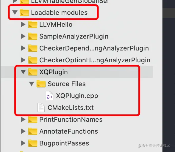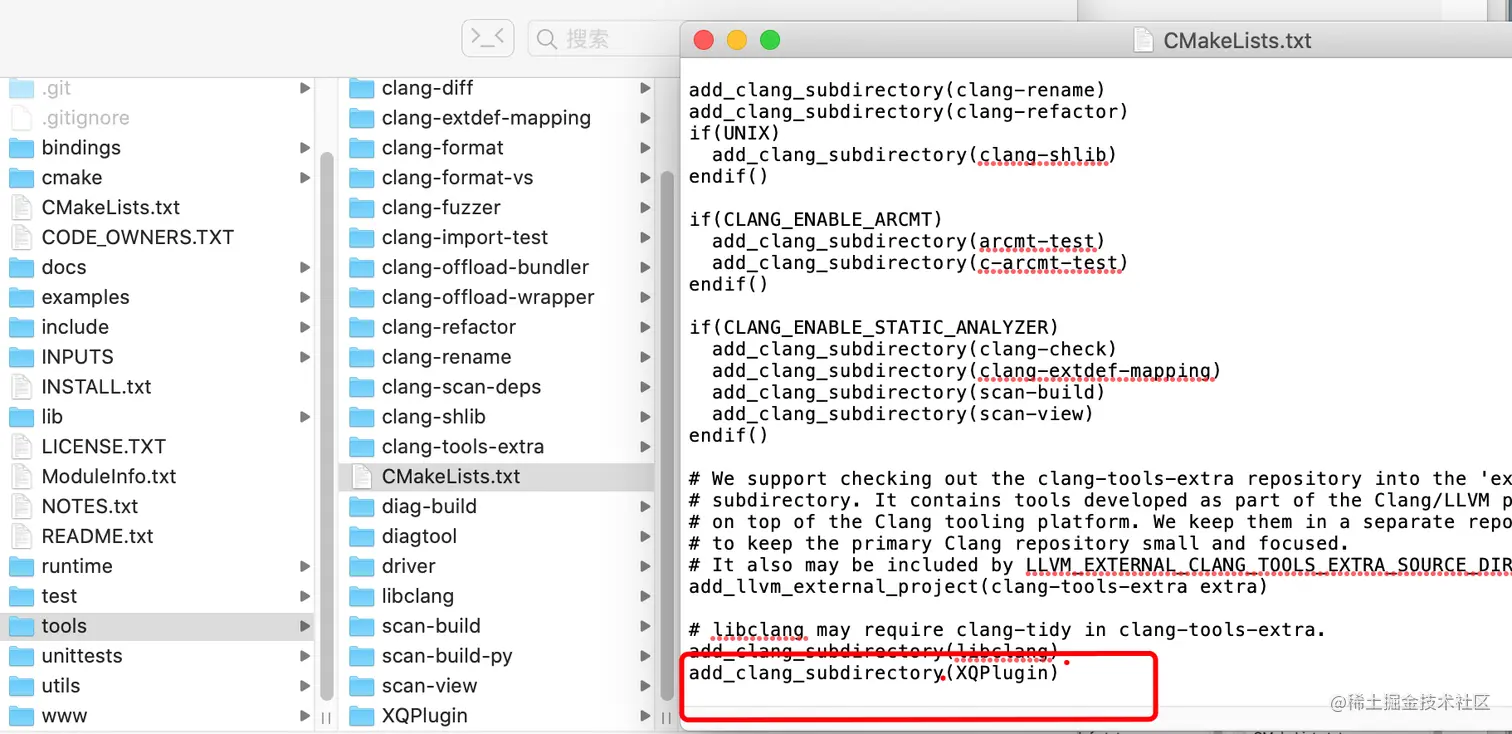 - 修改/llvm/tools/clang/tools目录下的CMakeLists.txt文件,在后面新增add_clang_subdirectory(XQPlugin)。
