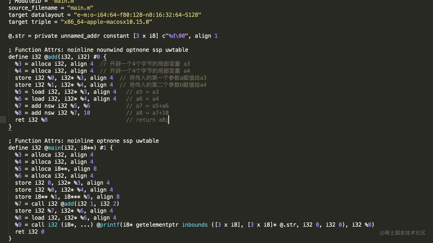 clang -S -fobjc-arc -emit-llvm main.m生成.ll文本文件,查看IR代码: