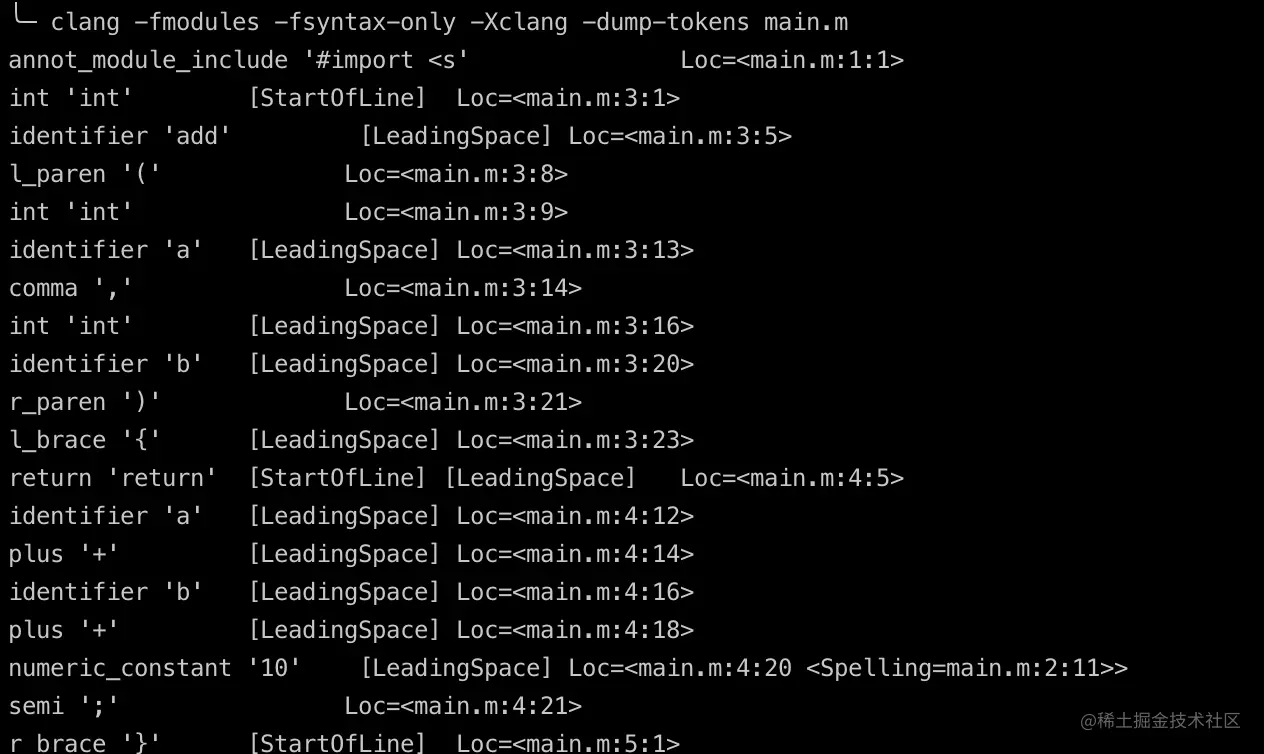 clang -fmodules -fsyntax-only -Xclang -dump-tokens main.m