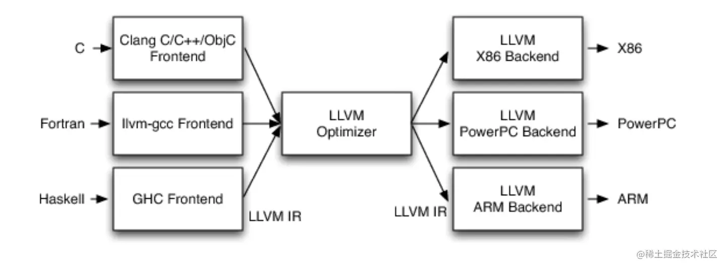 - LLVM可以为任何编程语言独立编写前端,也可以为任何硬件架构独立编写后端。