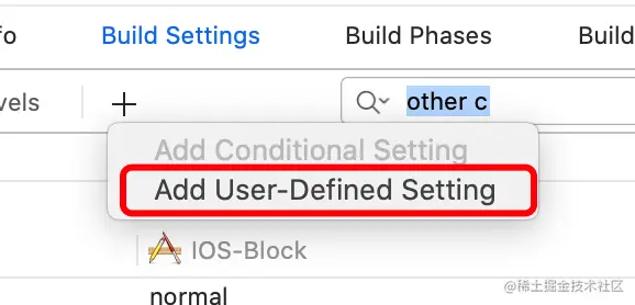 - 在Build Settings栏目中新增两项用户定义的设置