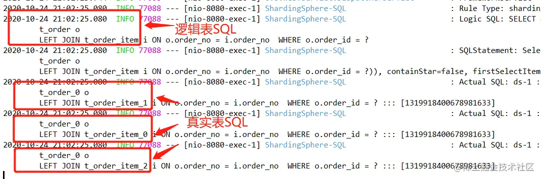 通过控制台日志发现,逻辑表SQL 经过解析以后,只对 t_order_0 和 t_order_item_0 表进行了关联产生一条SQL。