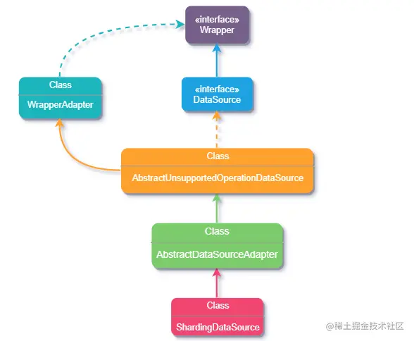其中 CommonDataSource 是定义数据源的根接口这很好理解,而 Wrapper 接口则是拓展 JDBC 分片功能的关键。