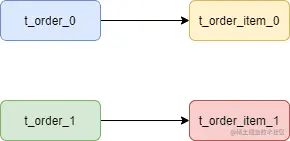 而配置绑定表关系后再进行关联查询时,只要对应表分片规则一致产生的数据就会落到同一个库中,那么只需 t_order_0 和 t_order_item_0 表关联即可。