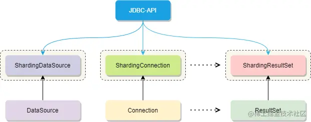 但其实对于开发人员而言,我们只关心如何调用 JDBC API 来访问数据库,只要正确使用 DataSource、Connection、Statement 、ResultSet 等 API 接口,直接操作数据库即可。所以如果想在 JDBC 层面实现数据分片就必须对现有的 API 进行功能拓展,而 Sharding-JDBC 正是基于这种思想,重写了 JDBC 规范并完全兼容了 JDBC 规范。