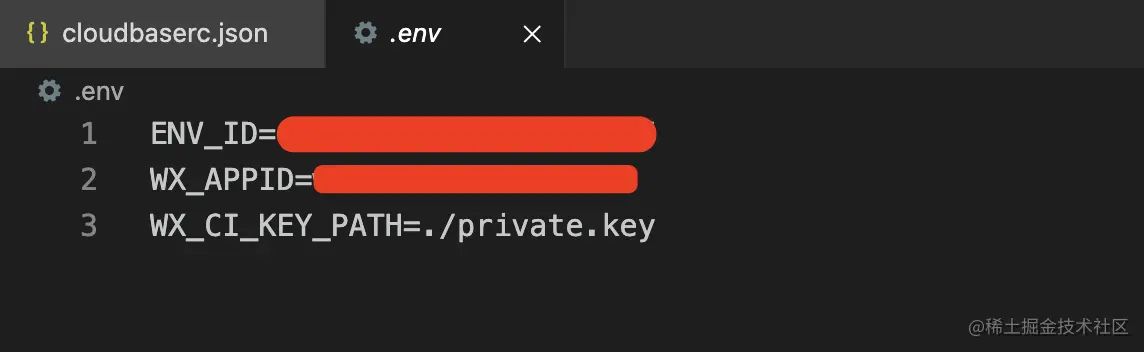 步骤三:创建env文件 在示例项目的根目录创建.env文件,设置自己的环境变量参数,包括云开发的环境ID,小程序appid,以及小程序代码上传私钥。具体效果如下: ENV_ID=替换你的云开发环境ID WX_APPID=替换你的微信小程序appid WX_CI_KEY_PATH=小程序上传密钥文件路径