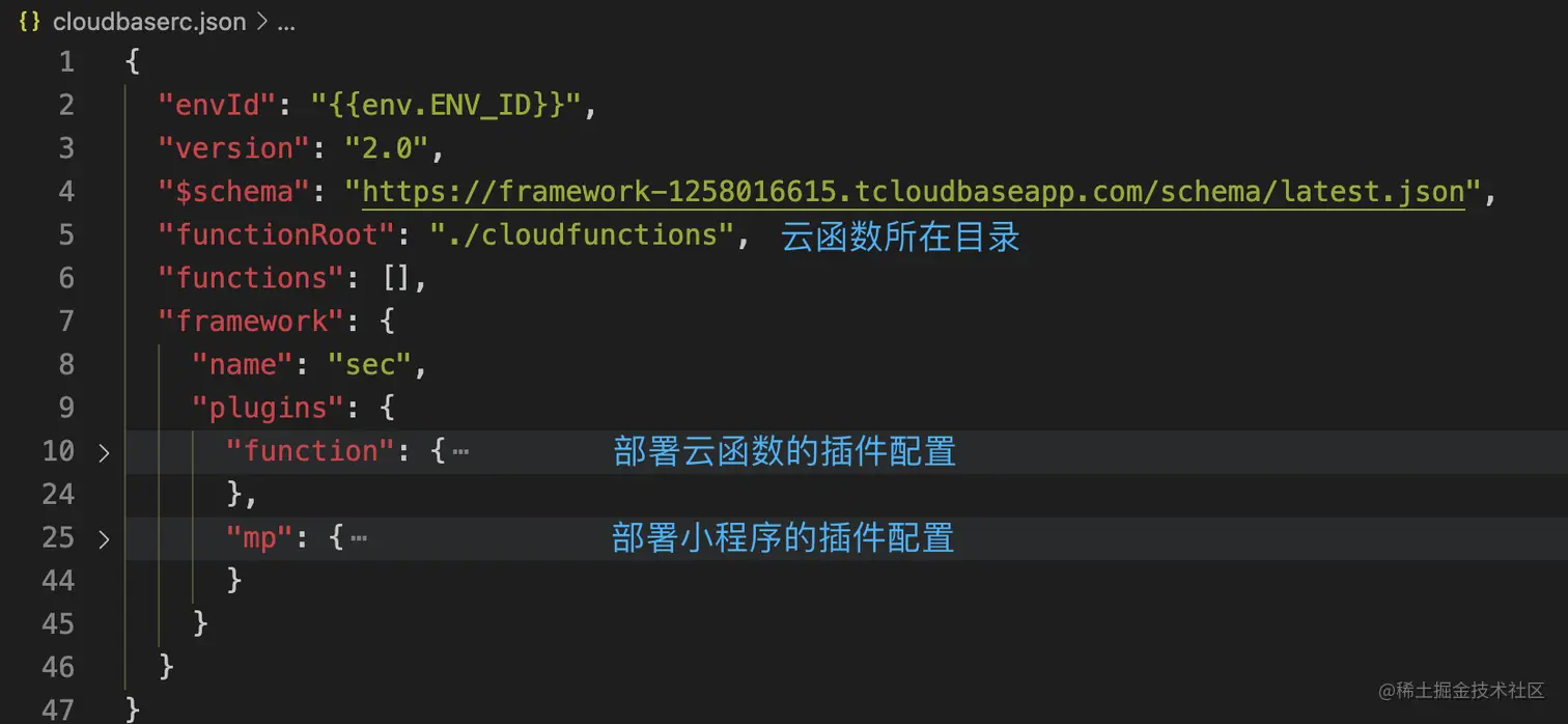 步骤二:配置cloudbaserc文件 项目的根目录中,有cloudbaserc.json文件,这是CloudBase-FrameWork工作的保障和依据。