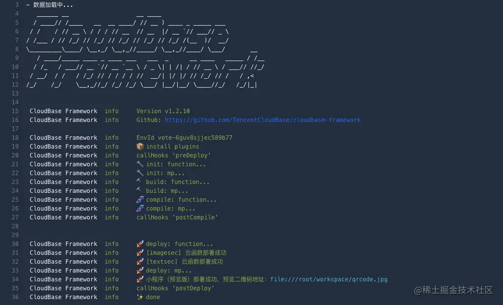 之后,cloudbase-framework就根据配置文件的要求进行部署,并将小程序的预览二维码保存到规定的地方。