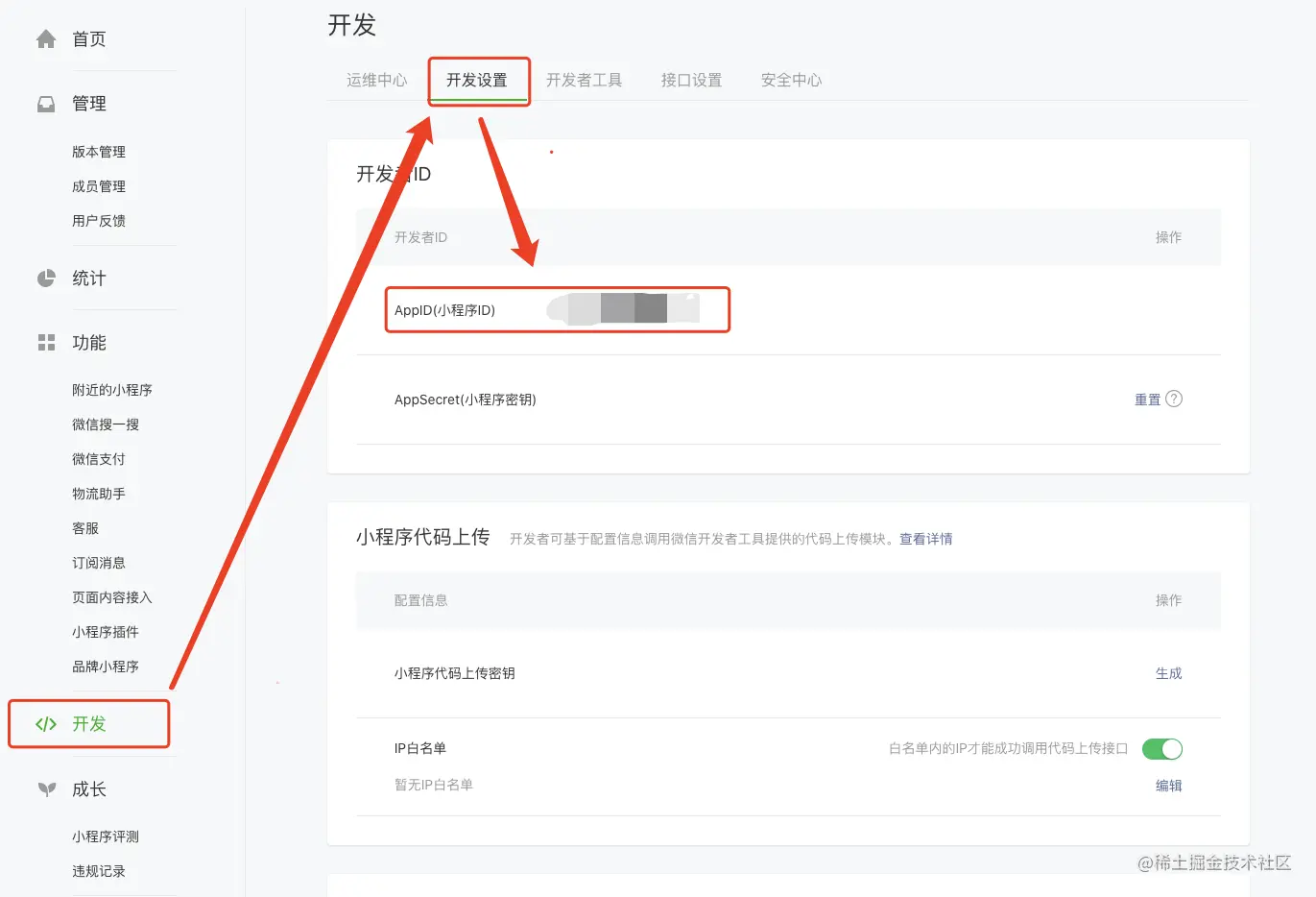 小程序appid是一个微信小程序的关键标识信息,可以在开发者后台的开发栏目里看到,如下图所示: