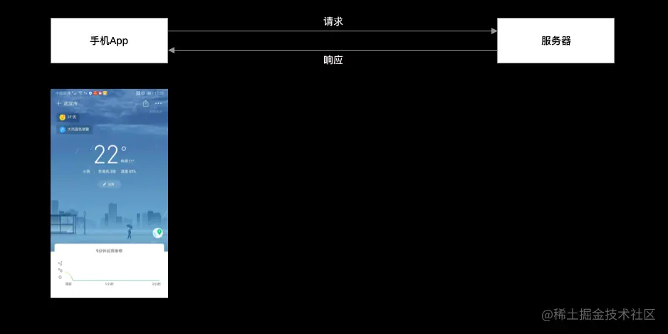用户点击或者界面自动触发联网需求 -> Android代码调用拼装 HTTP 报文并发送给服务器 -> 服务器处理请求后发送响应报文给手机 -> Android代码处理相应报文并作出相应的处理(如存储数据,加工数据,显示数据到界面)