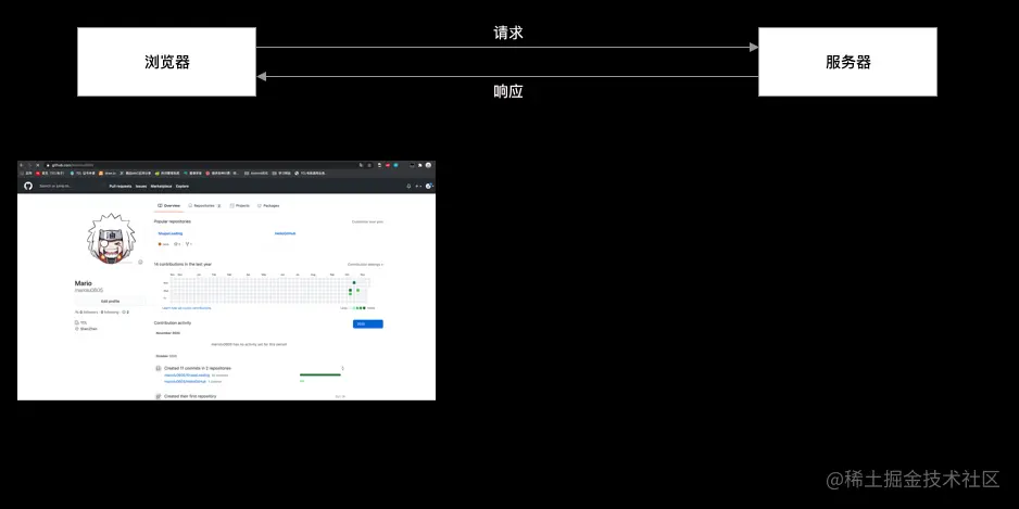 用户输入地址后回⻋或点击链接 -> 浏览器拼装 HTTP 报文并发送请求给服务器 -> 服务器处理请求后发送响应报文给浏览器 -> 浏览器解析响应报文并使用渲染引擎显示到界面