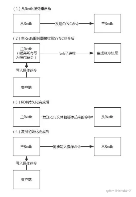 ③当主数据库执行完保持快照后,会向从数据库发送RDB文件,而从数据库会接收并载入该文件。