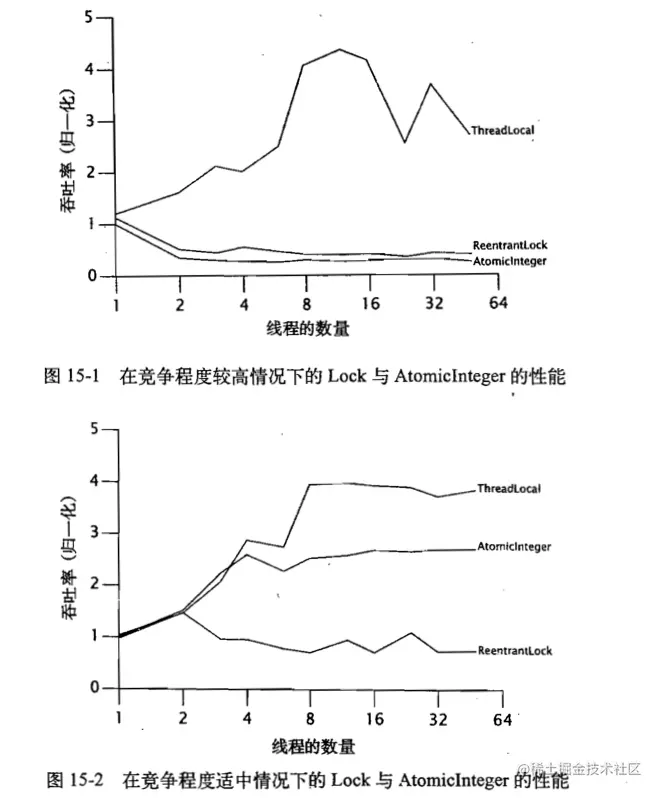 锁与原子变量在不同竞争程度上的性能差异很好地说明了各自的优势和劣势。在中低程度的竞争下,原子变量能提供更高的可伸缩性,而在高强度的竞争下,锁能够更有效地避免竞争。(在单CPU的系统上,基于CAS的算法在性能上同样会超过基于锁的算法,因为CAS在单CPU的系统上通常能执行成功)