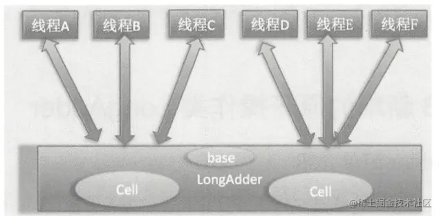 使用LongAdder时,则是在内部维护多个Cell变量,每个Cell里面有一个初始值为0的long型变量,这样,在同等并发量的情况下,争夺单个变量更新操作的线程量会减少,这变相地减少了争夺共享资源的并发量。另外,多个线程在争夺同一个Cell原子变量时如果失败了,它并不是在当前Cell变量上一直自旋CAS重试,而是尝试在其他Cell的变量上进行CAS尝试,这个改变增加了当前线程重试CAS成功的可能性。 最后,在获取LongAdder当前值时,是把所有Cell变量的value值累加后再加上base返回的。