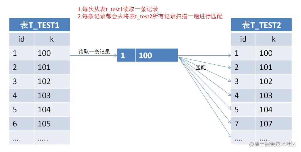其实在没有任何索引的情况下,left join使用的是Nested-Loop Join方式,原理是通过双层循环比较数据来获得结果,但是这种算法效率很低,举个例子,表t_test1中有有1000条数据,表t_test2中有100条记录,那么对数据比较的次数=1000 * 100=10万次,很显然这种查询效率会非常低。