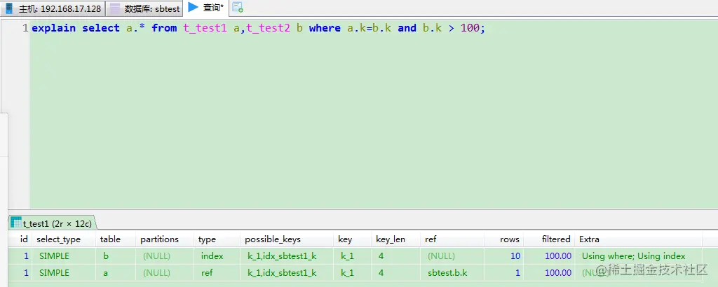 mysql> explain select a.* from t_test1 a join t_test2 b where a.k=b.k and b.k>100;
