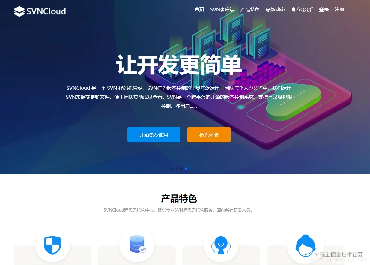 SVNCloud 在线免费SVN代码托管服务MYSQL数据库托管服务器 用户7323715624741 2020-11-19 261 阅读1分钟 wsfdb.cn SVNCloud 是一个专业提供的SVN服务、代码托管、数据库托管。 SVN服务不限项目数量、不限成员数量,不限外部成员、支持目录级权限控制、各项目独立成员管理、在线web管理你的SVN项目。 让移动办公变的更简单。