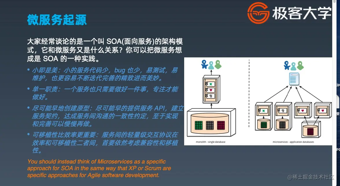 SOA面向服务的架构模式,它和微服务又是什么关系?可以把微服务想成是 SOA 的一种实践。