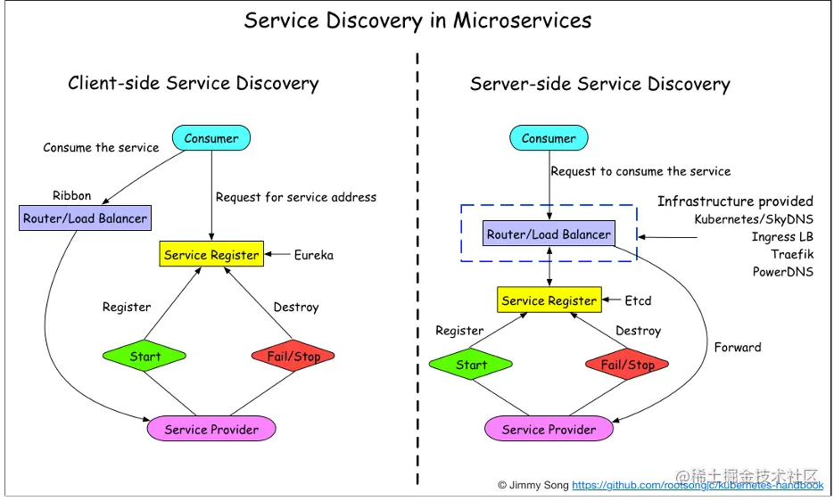 客户端通过负载均衡器向一个服务发送请求,这个负载均衡器会查询服务注册表,并将请求路由到可用的服务实例上。服务实例在服务注册表上被注册和注销(Consul Template+Nginx,kubernetes+etcd)。
