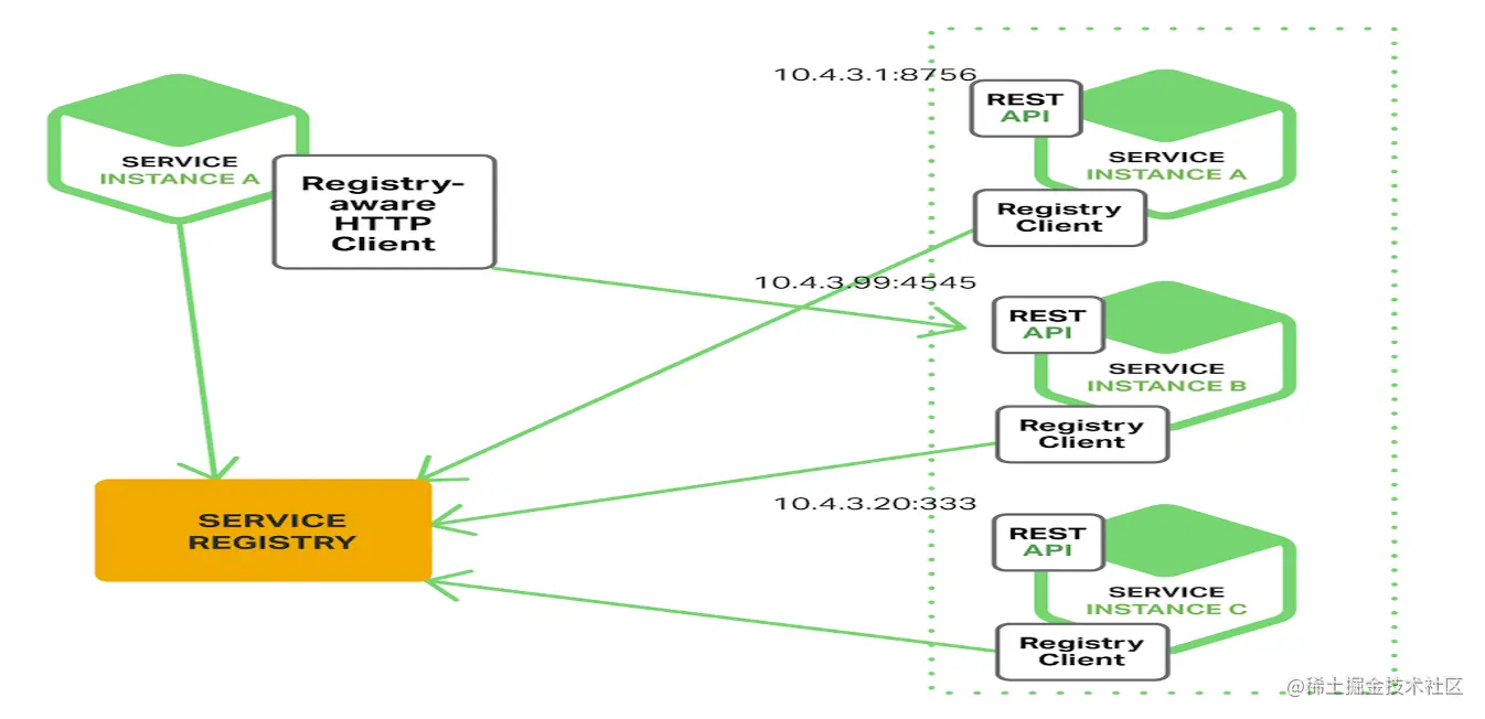 - 一个服务实例被启动时,它的网络地址会被写到注册表上;