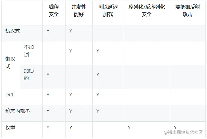 默认枚举实例的创建是线程安全的,所以不需要担心线程安全的问题。同时他也是《Effective Java》中推荐的模式。最后通过枚举类,他能自动避免序列化/反序列化攻击,以及反射攻击(枚举类不能通过反射生成)。