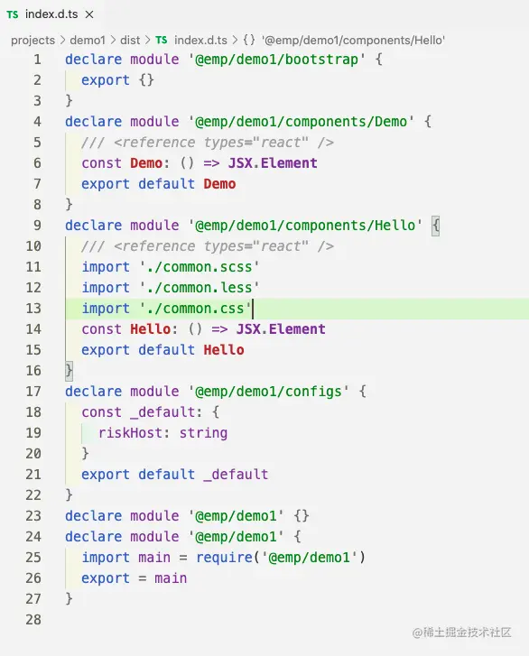 执行 yarn emp build --ts 后会生成有当前项目名作为路径前缀的类型文件 index.d.ts。