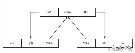 因为有保存前后节点的地址,LinkedList增删数据的时候不需要像ArrayList那样移动整片的数据,只需要通过引用指定index位置前后的两个节点即可,比如我们要在李白和韩信之间插入孙悟空的节点,只需要像这样处理下节点之间的指向地址: