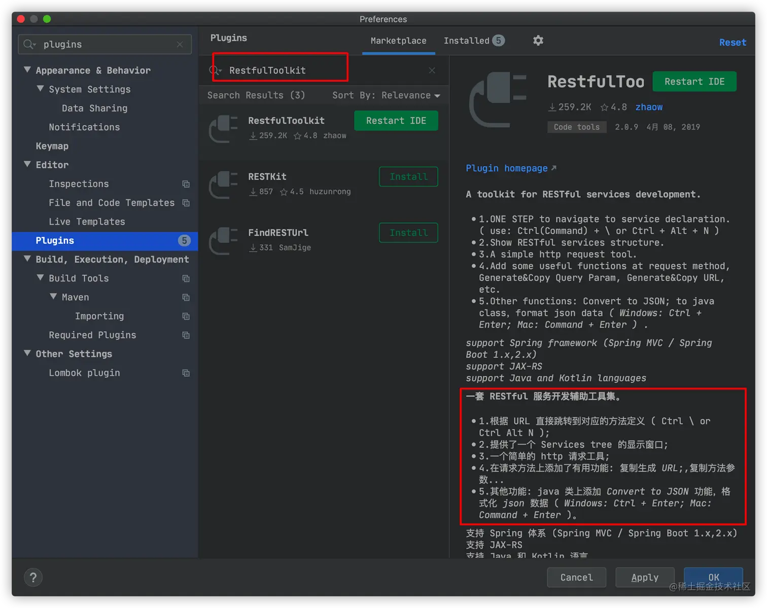 这个插件的名字叫做 “RestfulToolkit” 。我们直接在 IDEA 的插件市场即可找到这个插件。如下图所示。