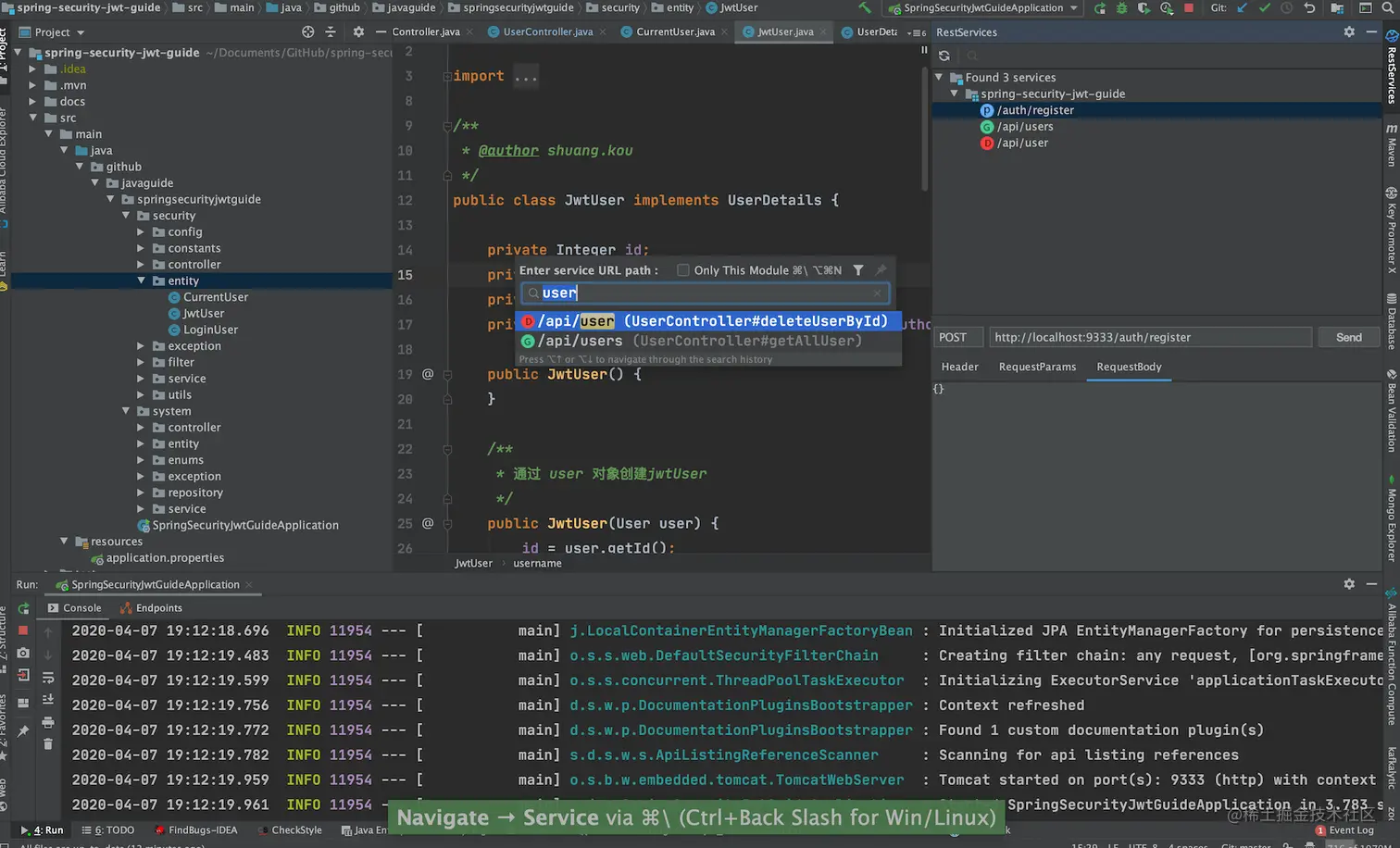 根据 URL 直接跳转到对应的方法定义 (Windows: ctrl+\ or ctrl+alt+n Mac:command+\ or command+alt+n )并且提供了一个服务的树形可视化显示窗口。 如下图所示。