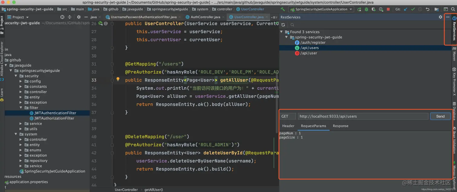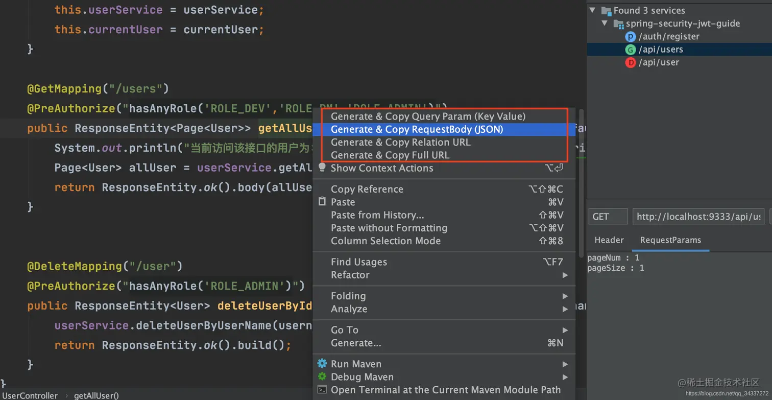 举个例子。我们选中 Controller 中的某个请求对应的方法右击,你会发现多了几个可选项。当你选择Generate & Copy Full URL的话,就可以把整个请求的路径直接复制下来。eg:http://localhost:9333/api/users?pageNum=1&pageSize=1 。