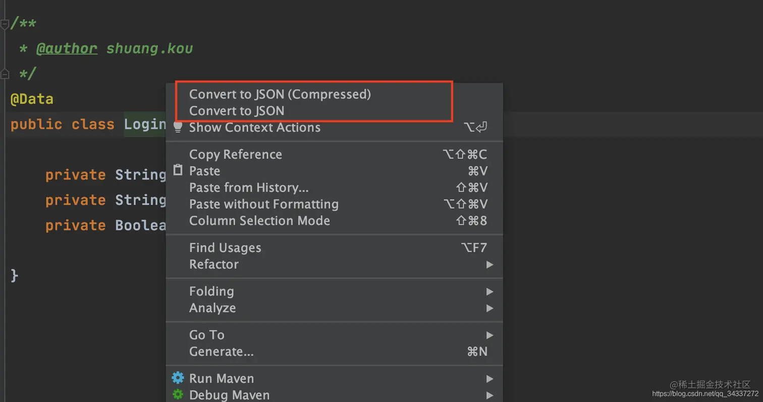 这个插件还为 Java 类上添加了 Convert to JSON 功能 。