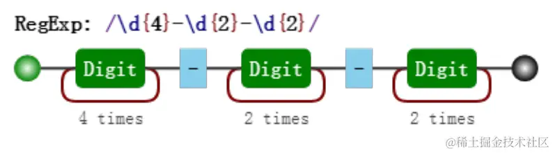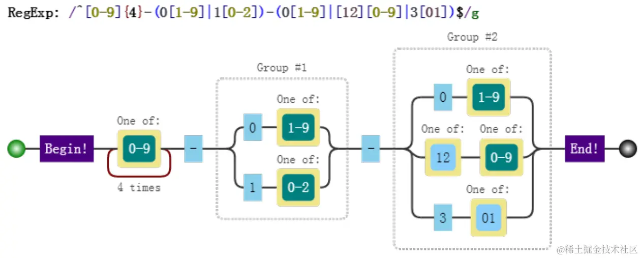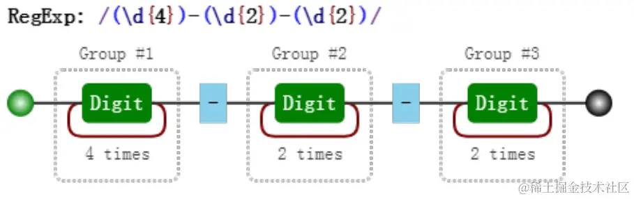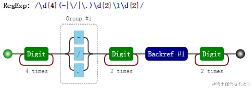 var regex = /(\d{4})-(\d{2})-(\d{2})/;对比这两个可视化图片,与前者相比,后者多了分组编号,如 Group #1。 正则引擎在匹配过程中,会给每一个分组都开辟一个空间,用来存储每一个分组匹配到的数据。 既然分组可以捕获数据,那么我们就可以使用它们