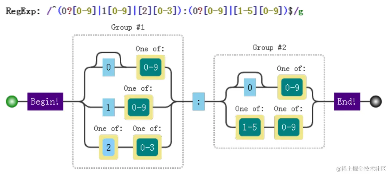 var regex = /^([01][0-9]|[2][0-3]):[0-5][0-9]$/; console.log( regex.test("23:59") ); console.log( regex.test("02:07") );如果也要求匹配 "7:9",也就是说时分前面的 "0" 可以省略 则为