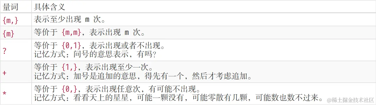 量词也称重复。掌握 {m,n} 的准确含义后,只需要记住一些简写形式