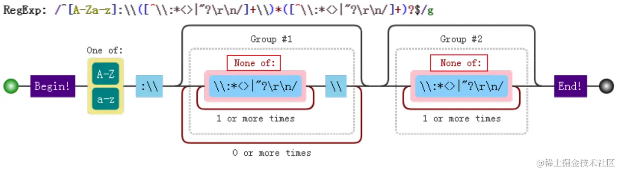 (2) 文件名或者文件夹名,不能包含一些特殊字符,此时我们需要排除字符组 \[^\\\\:*<>|"? \r \n/ ] 来表示合法字符。
