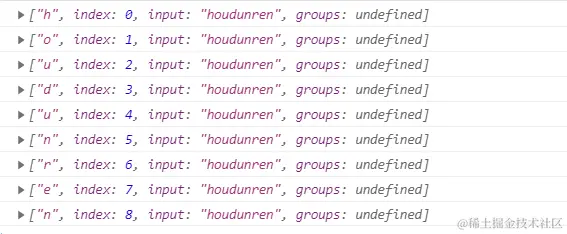 let str = "houdunren"; let reg = /[a-z]/ig; for (const iterator of str.matchAll(reg)) { console.log(iterator); }(4) 替换