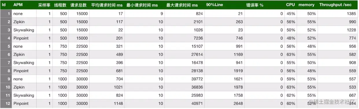 pinpoint默认的采样率为20,即50%,通过设置agent的配置文件改为100%。zipkin默认也是1。组合起来,一共有12种。下面看下汇总表: