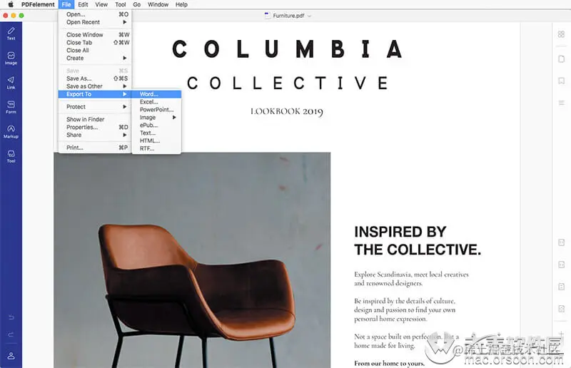 在Mac版PDFelement中打开PDF文件后,单击顶部菜单栏上的“文件”>“导出至”按钮,将其转换为Word文档。在这种情况下,您需要选择“单词”。