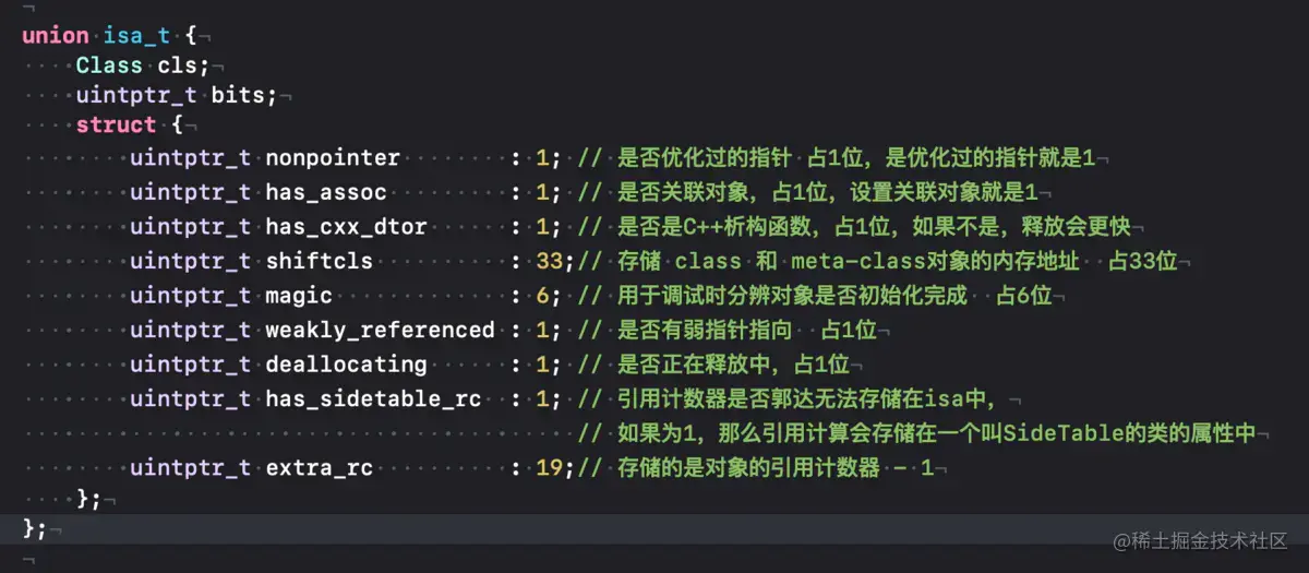 Objective-C的对象里面的isa指针已经不是单单的指向所属类的地址了的指针了,而时变成了一个共用体,并且使用位域来存储更多的信息