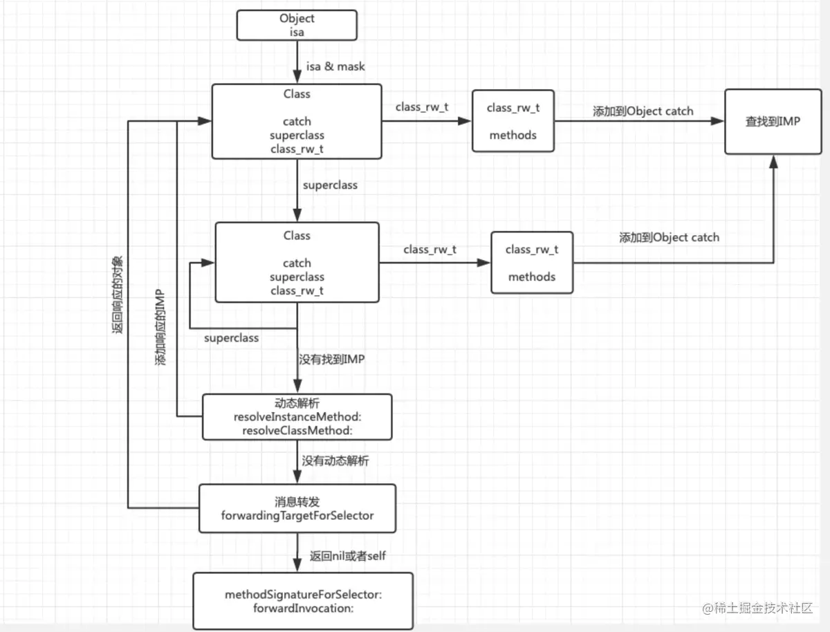 superclass指针,查找super的catch,如果也是没有查找,会继续查找到superclass里面的class_rw_t里面的methods(方法列表),从而遍历,找到方法所属的IMP,如果查找到则会添加到catch表里面 - 第五步,如果第四部还是没有查找到,此时会根据类的
