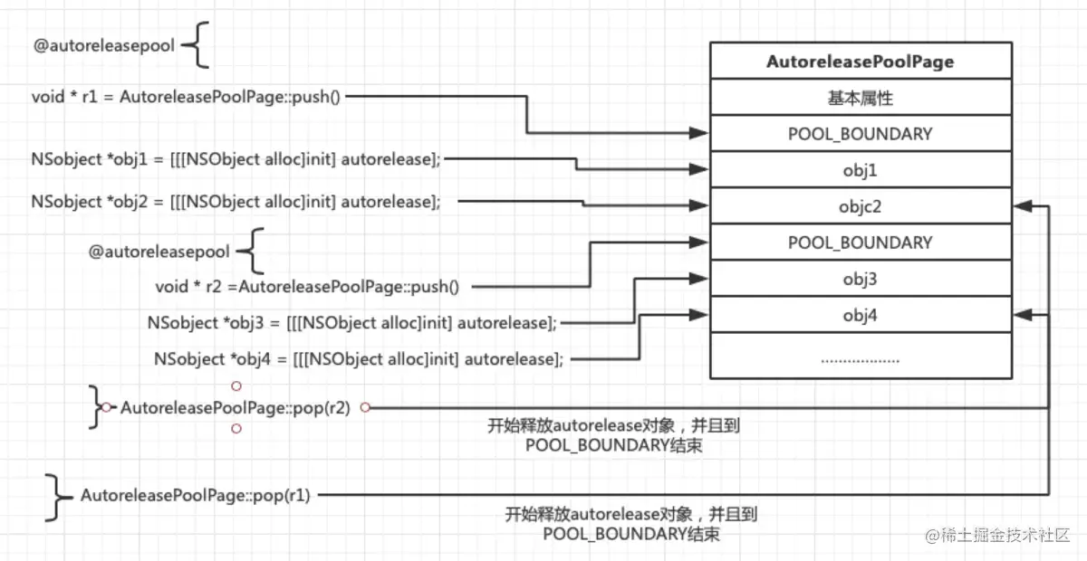 autoreleasepool作用域结束的时候,会调用AutorelasePoolPage的pop(r1)方法(r1为当前aotoreleasepool开始的加入标识POOL_BOUNDARY的地址),AutorelasePoolPage则会将里面保存的对象的从左后一个开始进行release操作,当碰到r1时候,标识当前那个autoreleasepool里面所有的对象都进行了一次release操作。@autoreleasepool { // 此处会调用 void *ctxt = AutoreleasePoolPage::push(); // 添加到最近的一个autoreleasepool中 [[[NSObject alloc]init] autorelease]; //移除作用域的时候调用 AutoreleasePoolPage:pop(ctxt) } // autoreleasepool 作用域开始会调用AutoreleasePoolPage::push() static inline void *push() { id *dest; if (DebugPoolAllocation) { // 创建一个心的page对象 dest = autoreleaseNewPage(POOL_BOUNDARY); } else { // 已经有了page对象,讲